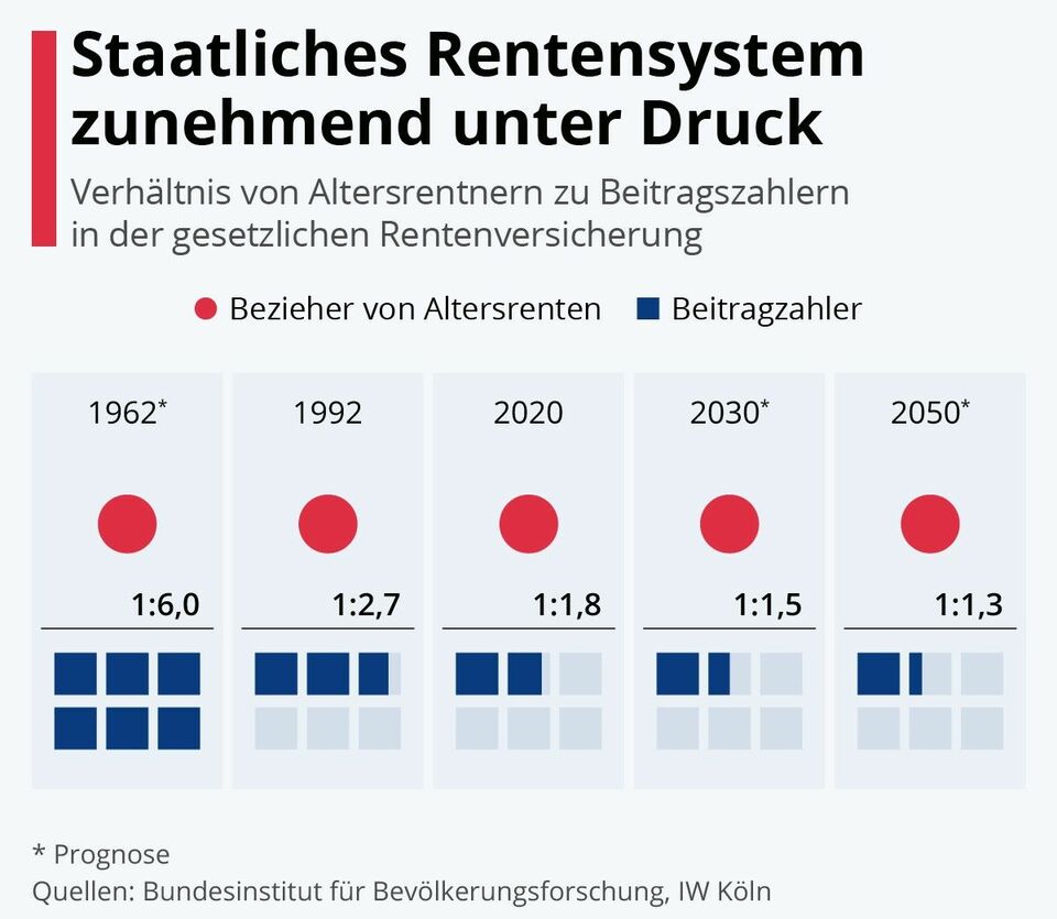Andererseits gibt es bei dieser Entwicklung aufgrund des Geburtenrückgangs und der anstehenden Verrentung der geburtenstarken Jahrgänge immer weniger Beitragszahler für die gesetzliche Rentenversicherung bei gleichzeitig immer mehr Rentenempfängern.